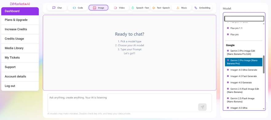 You can easily create high-quality photos with the latest AI models. In Dimarketo AI's plans, you can use Nano Banana Pro, GPT image 1, Grok 2 image, Flux Pro, and many more without purchasing separate, expensive accounts.